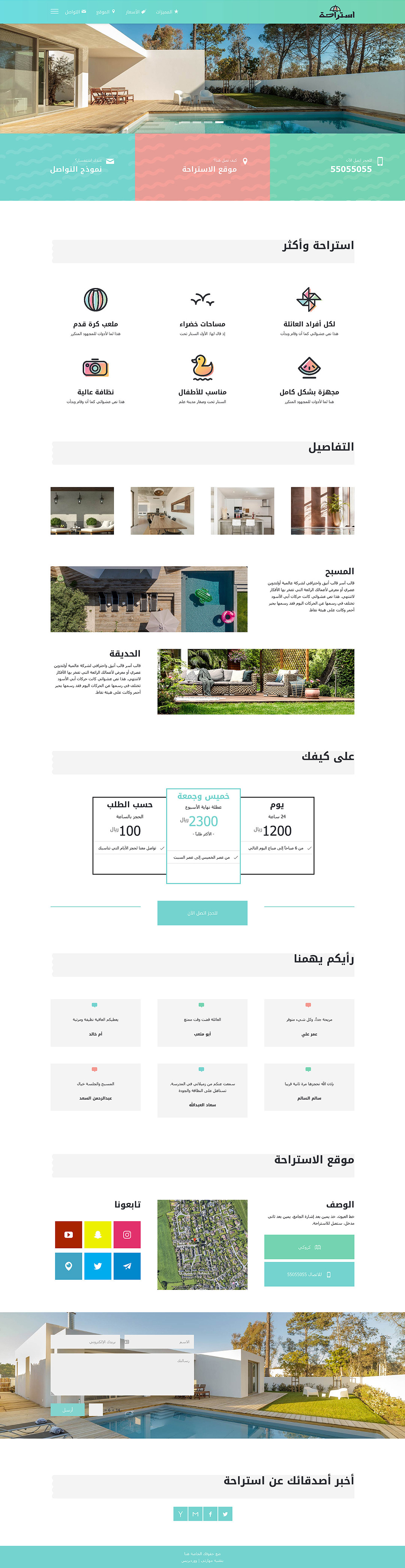 الأجواء بدأت تتحسن، وليس أجمل من الرحلات العائلية و جمعة الأصدقاء في البر، أو على شاطئ البحر، أو استراحة أنيقة. اليوم نقدم لكم تنسيق موقع استراحة تنسيق رائع لبناء موقع لاستراحة أو مزرعة أو مخيم. هذا التنسيق لصفحة واحدة، والمواقع التي تعتمد على صفحة واحدة مناسبة جداً لعرض المعلومات في مكان واحد يسهل الوصول إليه. هذا التنسيق يساعد العملاء والزوار على الوصول للموقع الجغرافي بدون عناء، وكذلك يحوي طرق مختلفة للتواصل مع المالك أو القسم المختص من خلال الهاتف أو نموذج التواصل. من مميزات المواقع ذات الصفحة الواحدة أنه يسهل التسويق لها، ببساطة أرسل الرابط للمهتمين.
