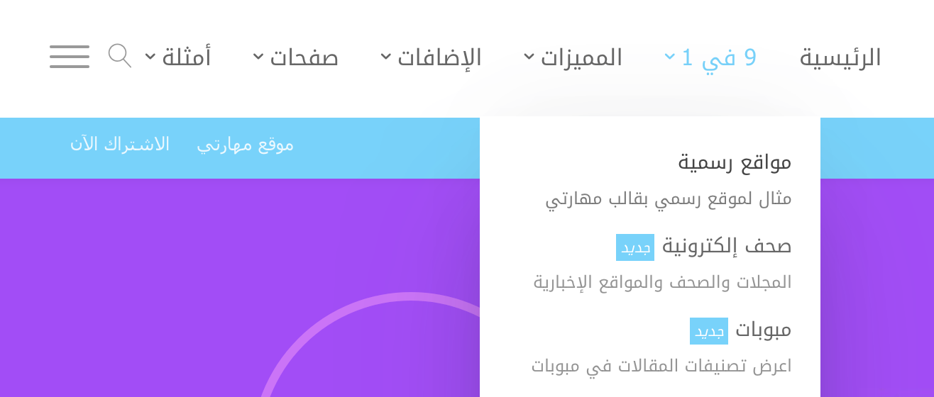 أضفنا ثلاثة تصاميم جديدة لأعلى الموقع، من ضمنها "عرض كامل" هذا سيجعل القائمة العلوية تملأ عرض الشاشة بشكل عصري.