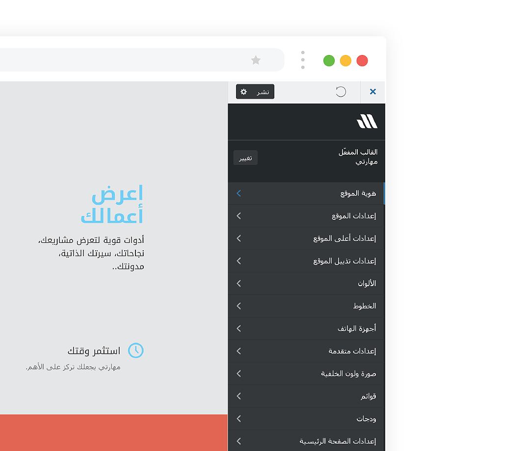 منطقة تخصيص القالب تحصل على مود ليلي أنيق. في قالب مهارتي نهتم بالشكل الخارجي الذي يراه زوار موقعك وأيضاً بمحتويات ومظهر لوحة التحكم.