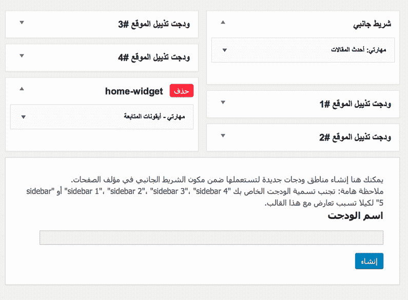 - ببساطة قم بإنشاء منطقة ودجات جديدة باختيار اسم في خانة اسم الودجت (وضعنا اسم “home-widget” بالمثال أعلاه) ثم قم بتحديث الصفحة لترى المنطقة الجديدة تم إضافتها مع مناطق الودجات الأخرى.