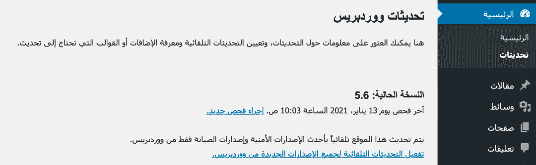 إن لم يكن ووردبريس محدثاً لآخر إصدار، قم بتحديثه بالضغط على رابط التحديث الظاهر في أعلى لوحة تحكم ووردبريس لموقعك أو بالذهاب إلى لوحة التحكم > تحديثات.