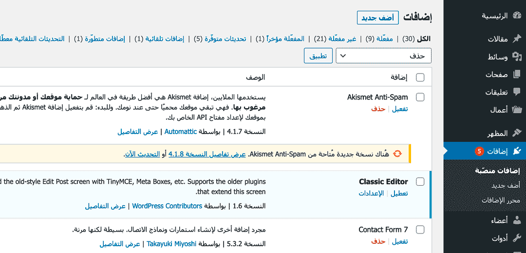 أما الإضافات التي تحتاجها فاحرص أن تكون محدثة باستمرار – اضغط على التحديث الآن واتبع الخطوات التي تظهر لك على الشاشة، ويمكنك الاستفادة أيضًا من ميزة التحديثات التلقائية وتفعيلها لكل إضافة لتكن محدثة باستمرار تلقائيًا.