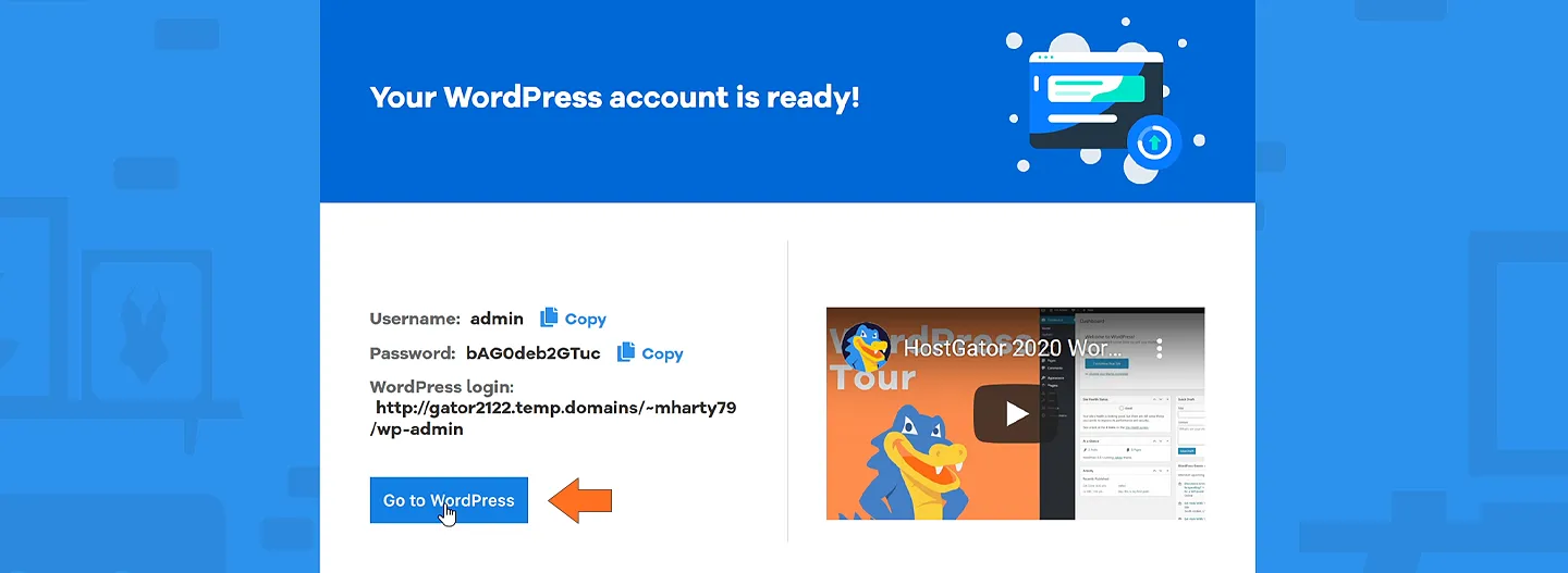 الآن سيتم إنشاء موقع ووردبريس وتزويدك بمعلومات الدخول للوحة تحكم ووردبريس كما في الصورة التالية. احتفظ بهذه المعلومات (يمكنك تغيير كلمة المرور لاحقًا)
