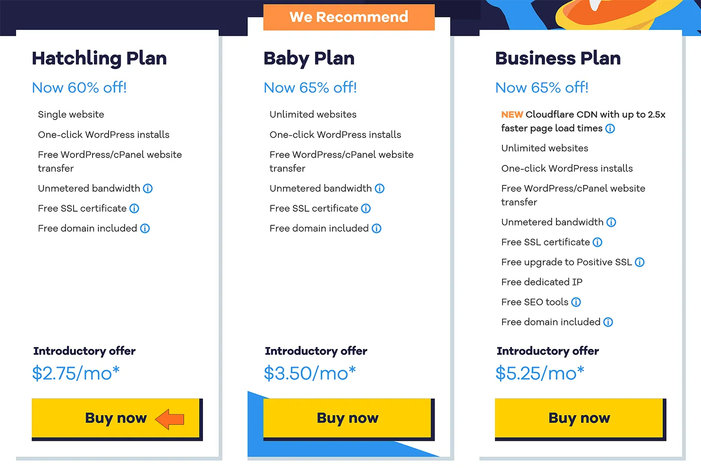 أقترح عليك اختيار باقة صغيرة بسعر مناسب، هذا سيجعل التكلفة منخفضة مبدئيًّا، والسبب الآخر أن تتمكن من تجربة الاستضافة ومدى مناسبتها لموقعك وحجمه. ويمكنك الترقية في أي وقت لاحقًا. (السعر الظاهر في الصورة قد يكون أقل أو أكثر حسب العروض المتوفرة وقت اشتراكك)