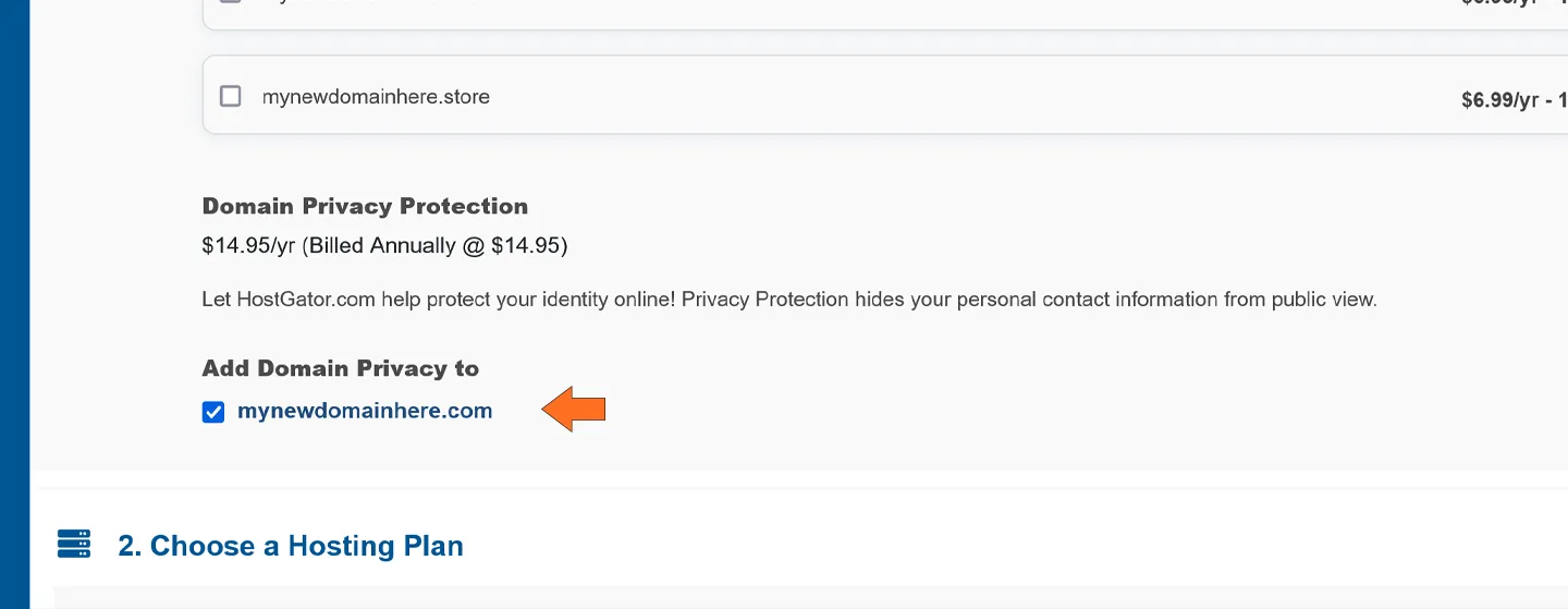 بعد اختيار الباقة المرغوبة، ستنتقل إلى منطقة اختيار الدومين. اكتب الدومين المرغوب في الخانة كما في الصورة التالية. (إذا كان الدومين محجوزًا من قبل فسيقترح عليك بدائل، ويمكنك اختيار دومين مختلف)