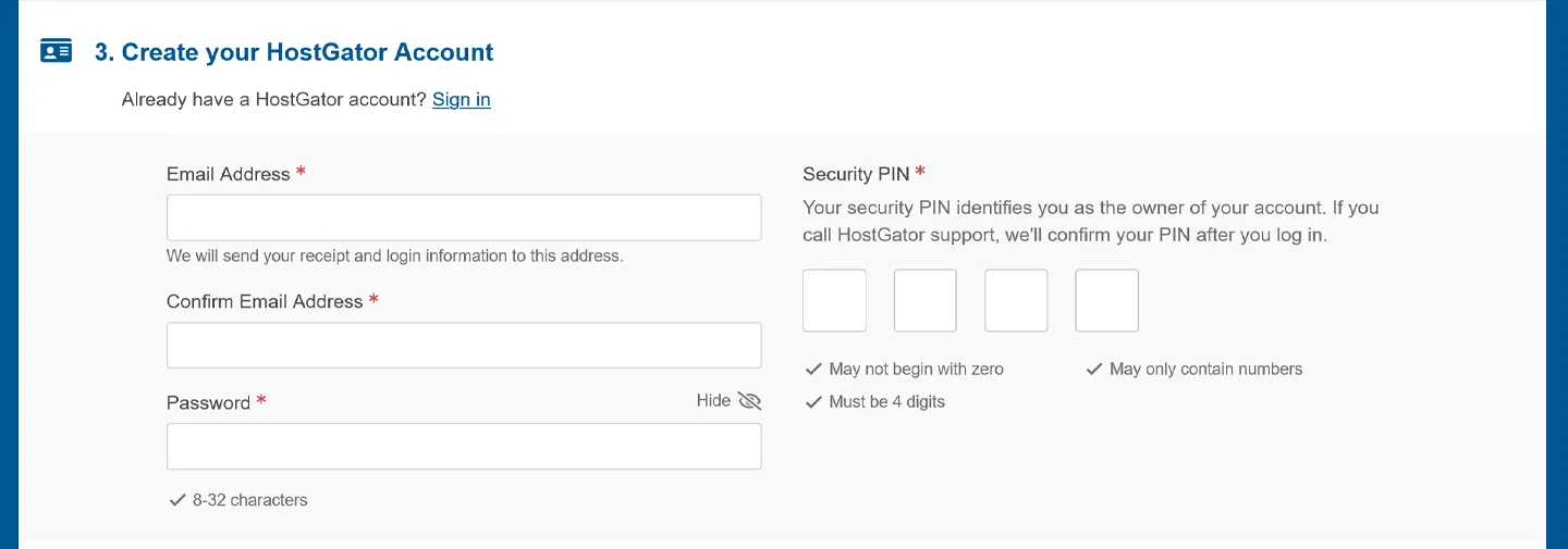 الآن اكتب بياناتك لإنشاء حسابك في شركة الاستضافة، في الخانات الظاهرة لك: البريد الإلكتروني، ثم تأكيده مرة أخرى، وضع كلمة المرور. وفي الجانب المقابل ضع رقمًا سريًّا - Security PIN- مكونًا من أربعة أرقام، هذا الرقم سيطلبه منك فريق الدعم إذا تواصلت معهم مستقبلًا.