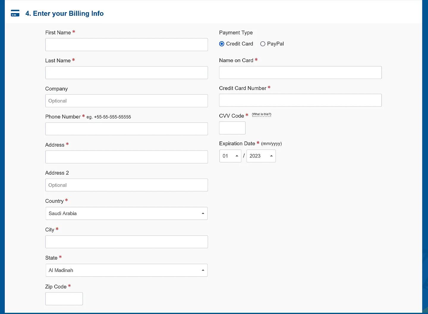 - ابدأ بملء بيناتك: الاسم، والهاتف، والعنوان، والبلد، والمدينة، والرمز البريدي - كل الخانات المطلوبة عليها نجمة