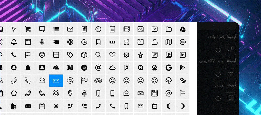 من المميزات التي أضفناها لكم في إصدار سابق لقالب مهارتي ميزة اختيار أيقونة لعناصر القائمة وهذه الميزة لاقت استحسانكم، طورنا طريقة اختيار الأيقونات ببساطة اضغط واختر الأيقونة المرغوبة.