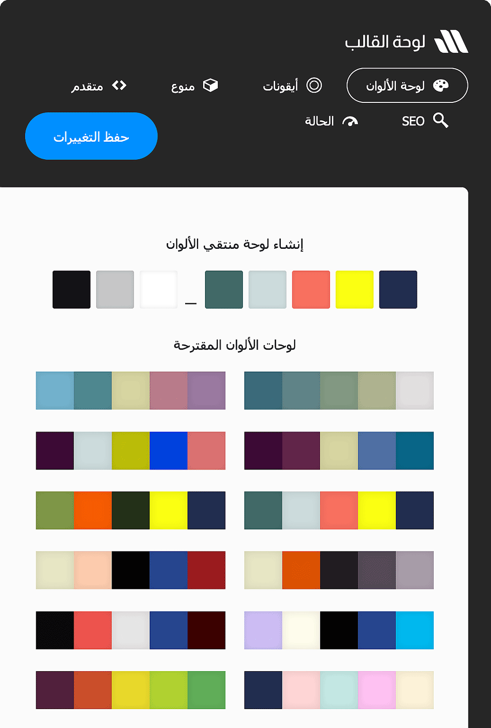 منطقة اختيار ألوان احترافية ولوحة قالب مطورة