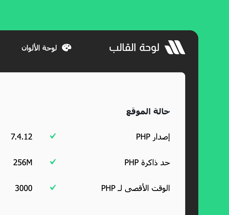 - ضمن لوحة القالب هناك تبويب جديد باسم ”الحالة“ والذي يوفر لك معلومات عن السيرفر وبعض التوصيات لأداء أفضل