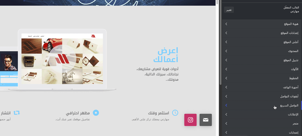 - جديد: أيقونة التواصل الاجتماعي السريع اعرضها في موقعك بسهولة من خلال منطقة تخصيص القالب، واختر بين أكثر من 20 شبكة تواصل، مثل تويتر، واتساب، انستجرام، زووم، كلوب هاوس، تيك توك، سناب شات وغيرها. ستجدها في: مهارتي > تخصيص القالب > التواصل السريع