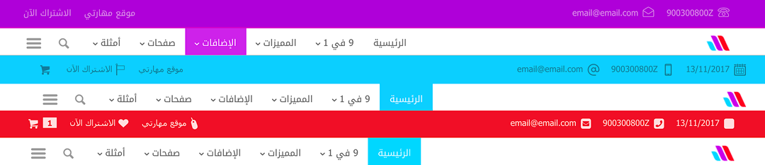 ميزة تم طلبها بشكل كبير وهي إمكانية استخدام الأيقونات في القائمة الإضافية، وتلبية لرغبتكم تم توفير هذه الميزة وزيادة! فهناك ميزة جديدة جداً وهي: تغيير الأيقونات الخاصة بالتاريخ والهاتف والبريد الإلكتروني بسهولة من خلال تخصيص القالب. كما تعودتم من قالب مهارتي موقعك فريد ورائع وبلمستك الخاصة حتى في أدق التفاصيل، وبالطبع لم ننسَ توفير أيقونات إضافية جديدة للهاتف والبريد والتاريخ، متأكدون أنها ستنال إعجابك.