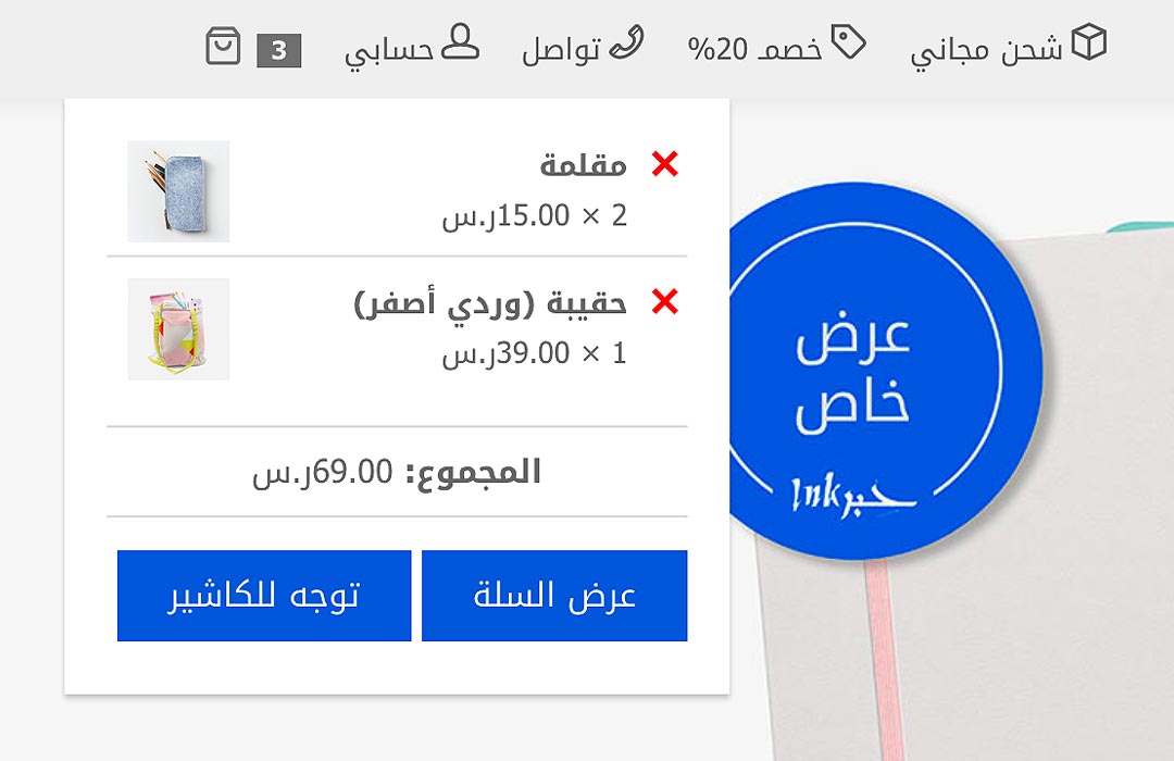 شكل أنيق للعناصر عند إضافتها لسلة الشراء تظهر في أعلى موقعك