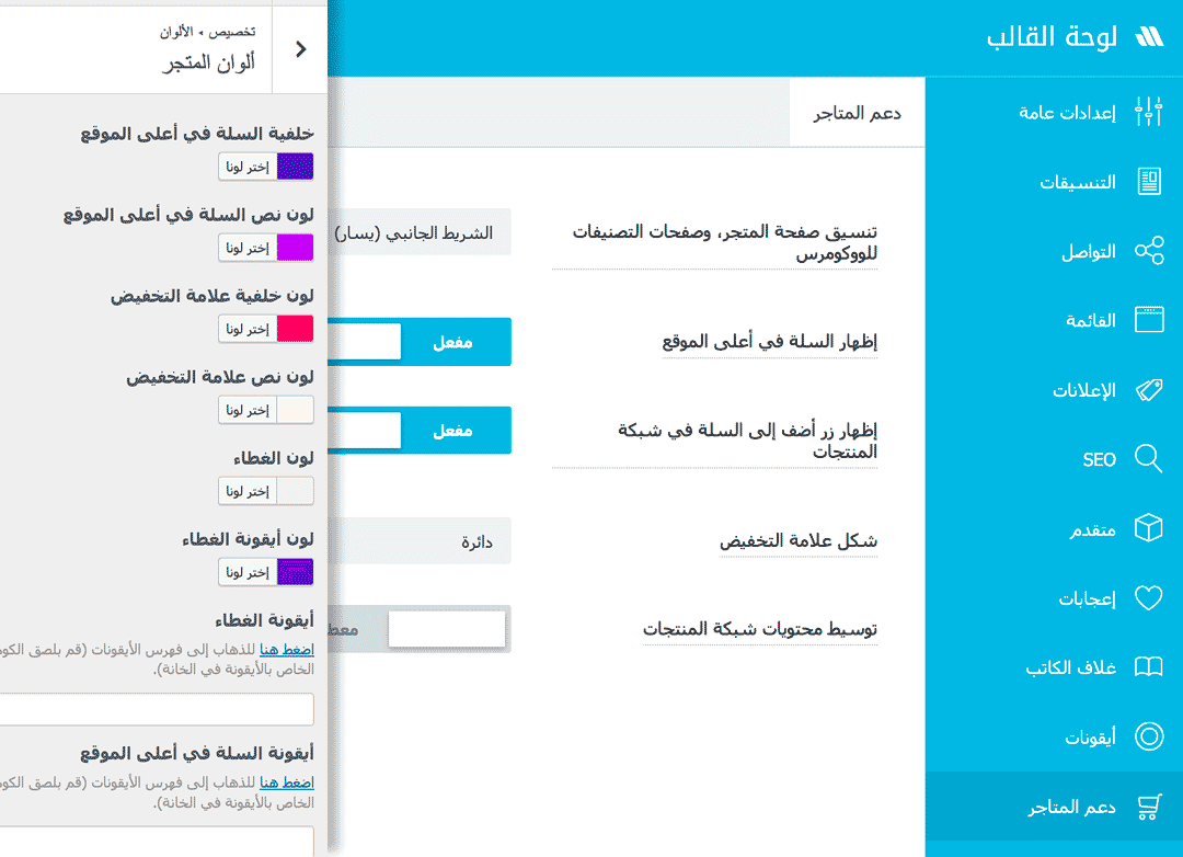 - إمكانية اختيار ألوان السلة في أعلى الموقع، وأيقونة ولون غطاء المنتجات
