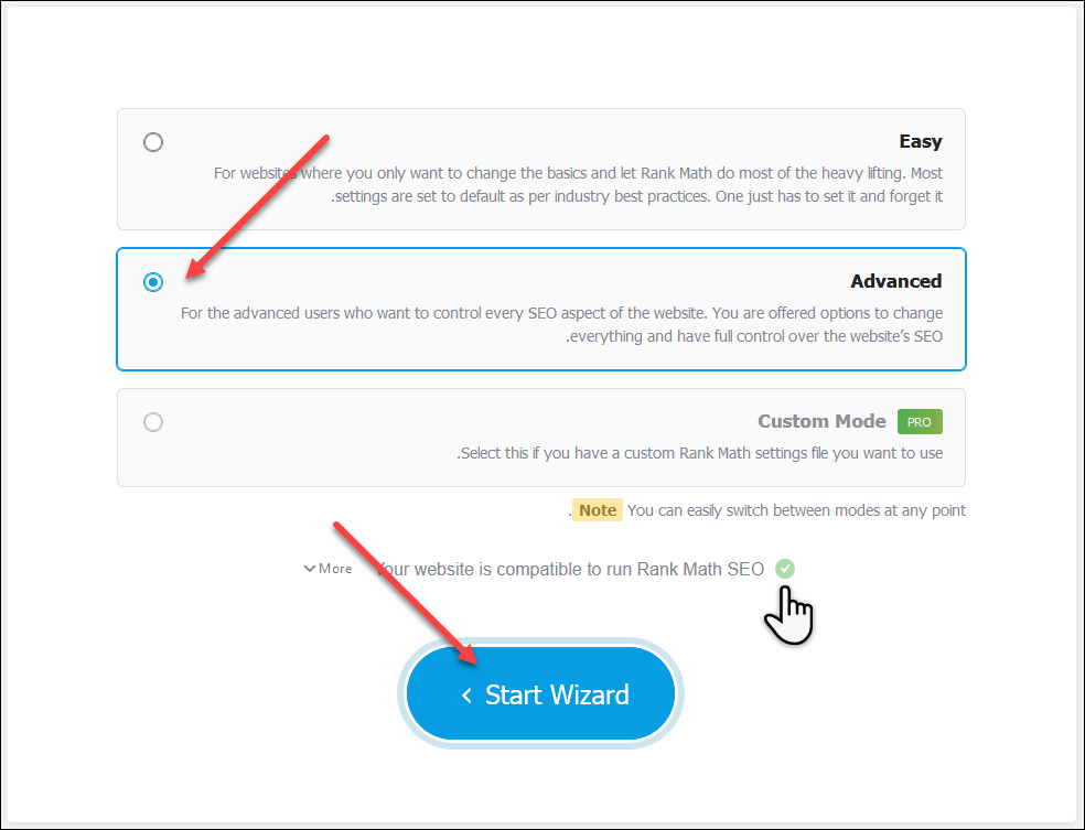 في هذا الشرح سنعمل على الوضع Advanced وهو وضع متقدم يضع في متناولنا الكثير من الخيارات والإعدادات. انتبه إلى السطر الأخير قبل زر البدء، هو عبارة عن تقرير سريع لمدى توافق موقعك وموارده مع إضافة Rank Math وعند وجود شيء يستحق التنبيه ستجد التنبيهات اللازمة. اضغط Start Wizard لبدء عملية الإعداد.