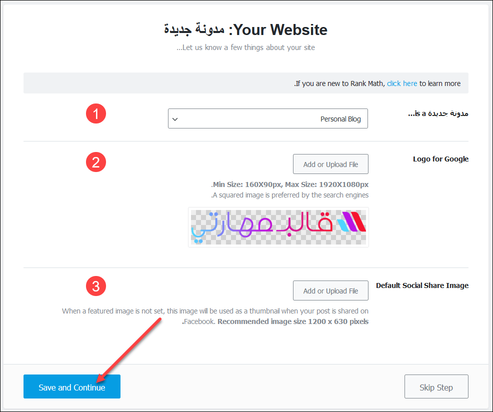 - Logo for Google: تحديد صورة لاعتمادها في محرك بحث جوجل، وموضح أصغر وأكبر قياس متاح للصورة، والأفضل أن تكون مربعة.