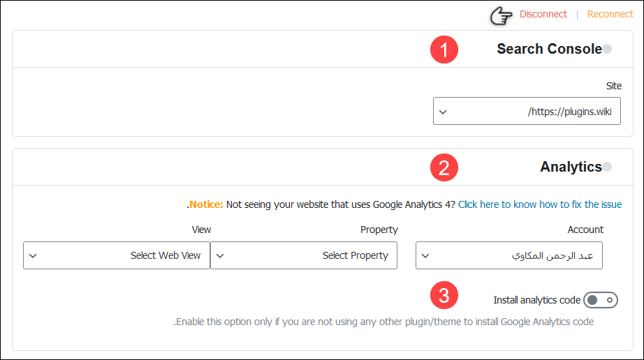 لا تنس وجود خيارين أعلى النافذة: Disconnect لقطع اتصال الموقع بهذا الحساب لدى جوجل، و Reconnect لإعادة الربط مرة أخرى حال حدث خطأ ما.