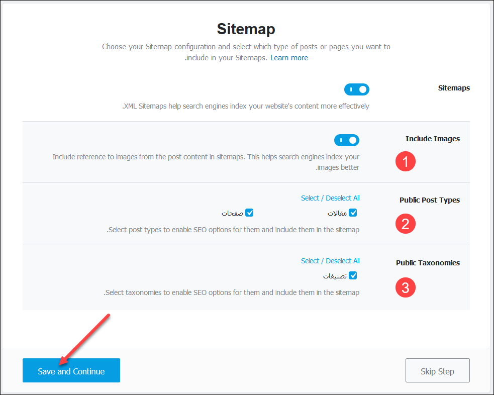 - Public Post Types: تحديد أنواع المحتويات التي تريد أرشفتها وإخبار محركات البحث عنها. الصفحات، والمقالات.