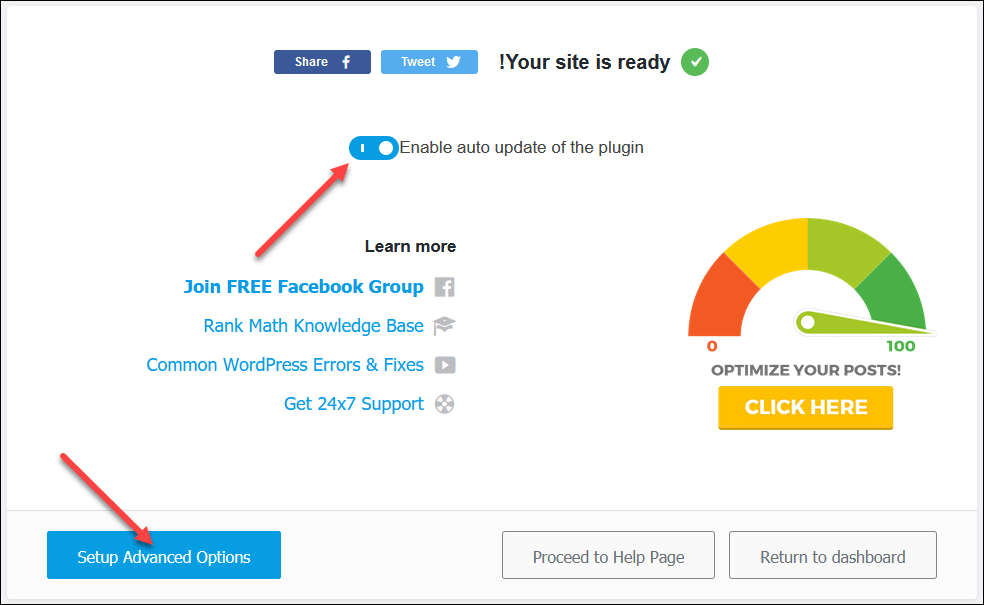 - ها نحن قد وصلنا إلى نهاية المعالج السريع، وهنا يمكنك تفعيل خيار التحديث التلقائي للإضافة، والانتقال إلى ضبط إعدادات أكثر تقدمًا.