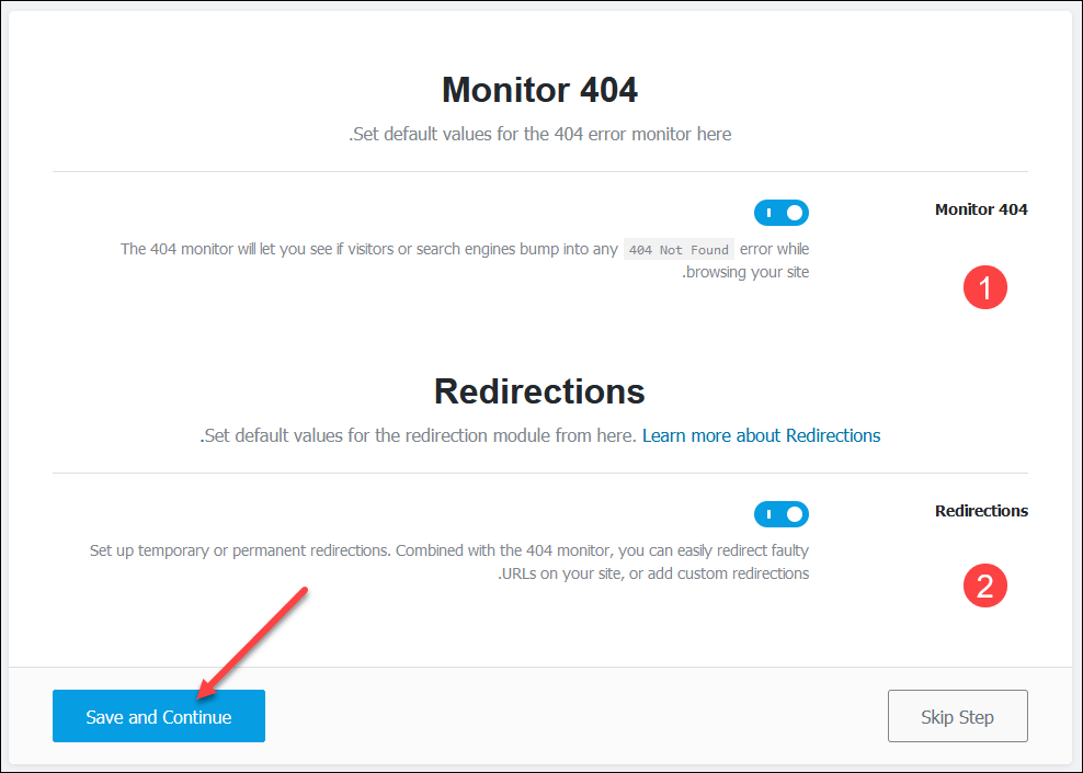 - هذه المرحلة مختصة بمراقبة أخطاء 404 وتفعيل أداة إعادة توجه الروابط من خلال Monitor 404 و Redirections.