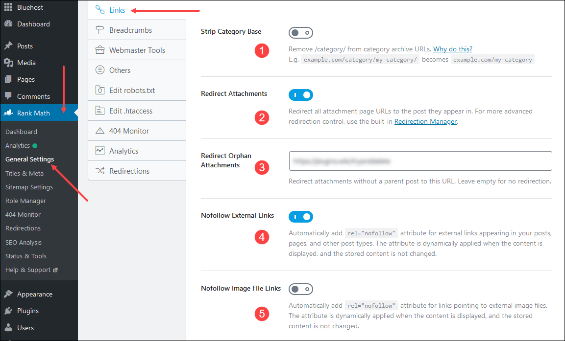 انتقل إلى Rank Math ثم General Settings ثم Links كما هو موضح في الصورة.