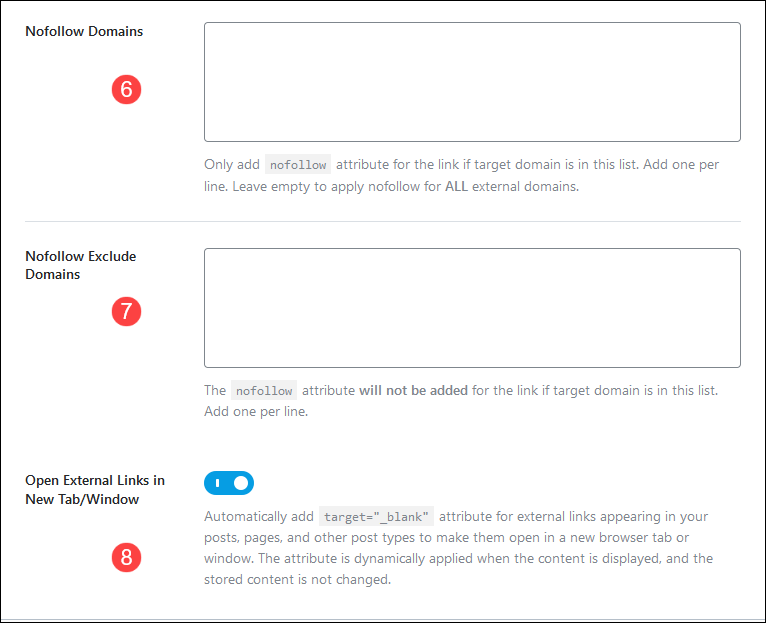 - Open External Links in New Tab/Window: فتح الروابط الخارجية في تبويب جديد إذا نقر عليها زائر موقعك، وهذا مفيد لموقعك؛ حيث يعود لك مرة أخرى بعد اطلاعه على الرابط الذي فتحه، فما زالت تبويبتك مفتوحة أمامه.