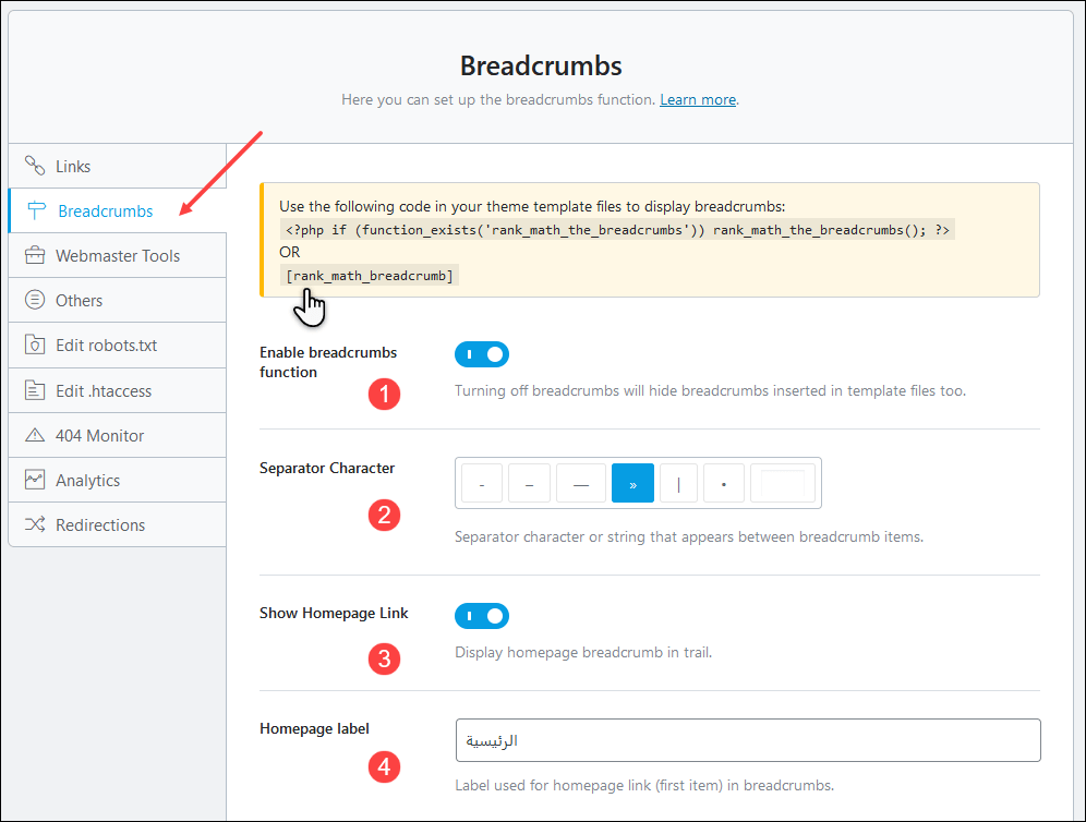 انتقل إلى Rank Math ثم General Settings ثم breadcrumbs كما بالصورة. مسارات التنقل هي سطر يخبر الزائر أين هذه الصفحة بالضبط في موقعك، عن طريق توضيح مسارها، وإلى أي قسم تنتمي. مثال: الرئيسية >> المدونة >> مقالات سيو >> شرح إعدادات إضافة Rank Math