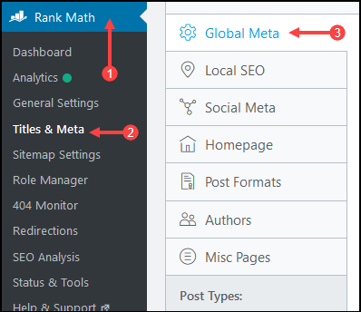 هذا أحد الأقسام المهمة في إعدادات Rank Math لضبط جزء مهم من أجزاء السيو. لن نتناول كل جزئية بالتفصيل لوجود أمور كثيرة مشتركة وبعض الأمور الفرعية، ولذلك سنوضح ما نحتاج إليه على النحو التالي. انتقل إلى Rank Math ثم Titles & Meta ثم Global Meta كما بالصورة.