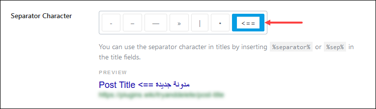 Robots Meta: من هنا يتم توجيه محركات البحث لطريقة التعامل مع المحتوى، وهي جزئية ستجدها مكررة مع المقالات والصفحات والوسوم والتصنيفات.. إلخ، ثم تجدها مكررة مع كل صفحة وكل مقالة وكل تصنيف.. إلخ في هذا التبويب يتم ضبط تلك الإعدادات للموقع بشكل عام، حيث تسري على كل جزء في الموقع ما لم نقم بتخصيص إعدادات لشيء ما في مكانها لاحقًا. وإليك توضيح دلالات هذه الاختيارات. Index: تمكين محرك البحث من الزحف إلى المحتوى وفهرسته وعرضه ضمن نتائج البحث. No Index: منع محرك البحث من فهرسة المحتوى وعرضه ضمن نتائج البحث، وهذا الخيار يمكن تحديده بالتبادل مع الخيار السابق، ولا يمكن اختيارهما معًا. No Follow: إخبار محرك البحث بعدم تتبع الروابط الموجودة داخل المحتوى. No Archive: إخبار المحرك بعدم عرض نسخة محفوظة سابقًا من المحتوى. No Image Index: فهرسة الصفحة، واستثناء الصور التي فيها من الفهرسة. No Snippet: إخبار محرك البحث بعدم عرض وصف أسفل عنوان هذه الصفحة عندما تظهر في النتائج. وهذه الخيارات الأربعة الأخيرة يمكن اختيارها جميعًا، أو بعضها بحسب احتياجك. الآن ننتقل إلى الفاصل الذي يظهر في عناوين الموقع، تحديدًا يظهر بين اسم الموقع وعنوان الصفحة المفتوحة، مثلًا: كشف وإصلاح مشاكل ووردبريس بسرعة | مدونة مهارتي. نحن نتكلم عن هذا الفاصل العمودي |