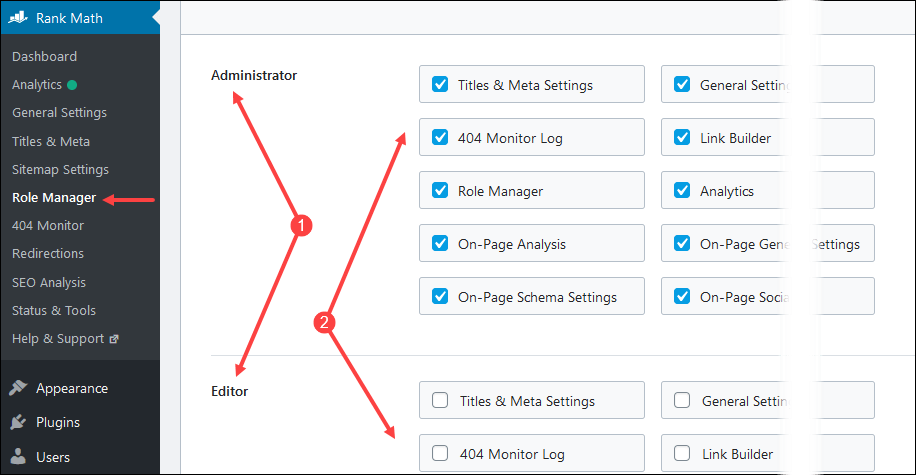 تعرضنا لهذه النقطة سابقًا وتتجدد الحاجة لها إذا كان على موقعك بعض الكتّاب ونحو ذلك من أدوار العضوية المختلفة. يمكن الوصول لهذه الإعدادات مرة أخرى من Rank Math ثم Role Manager كما بالصورة.