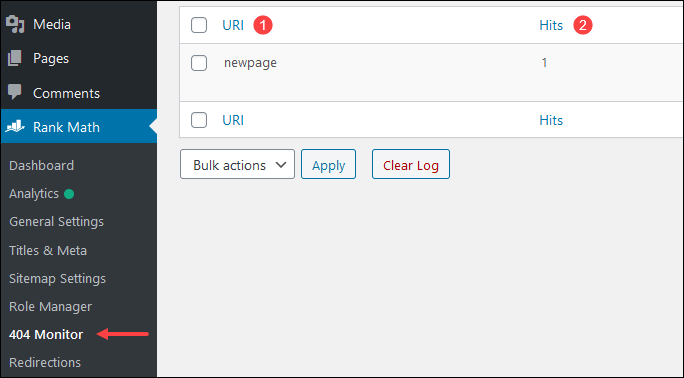 كذلك من الأمور المهمة متابعة أداة رصد الوصول إلى صفحات غير صحيحة لتتعرف على تلك الروابط، ومعالجة الأمر إن كانت هناك زيارات كثيرة على رابط معين. انتقل إلى Rank Math ثم 404 Monitor كما بالصورة.