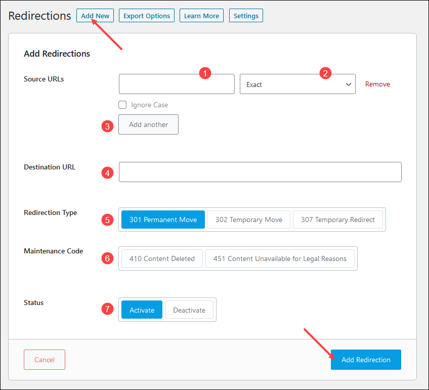 أكمل إعداداتك واضغط Add Redirections للحفظ، ويمكنك إضافة العديد من عمليات التحويل بضغط Add New مرة أخرى.